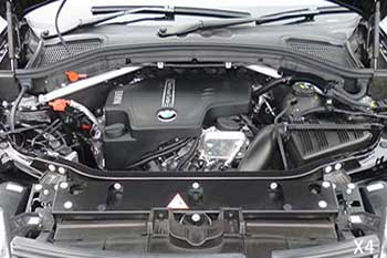 エンジンはどちらも4気筒 2.0L ターボで性能としては NX200t は 238ps/4,800-5,600rpm 350N-m /1,650-4,000rpm 、X4 xDrive 28i は 245ps/5,000rpm 350N-m /1,250-4,800rpm とほぼ同じ。外観は最近のエンジンらしく上部に樹脂製のカバーがかかっているので中は見えない。