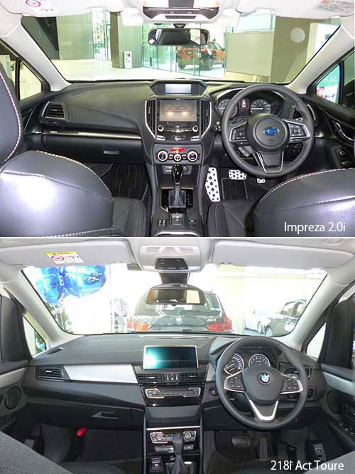 メーターについてはどちらも大径2眼式で、回転計と速度計を対象に配置している。そのメーターの間にあるディスプレイはインプレッサの方が広いし、しかもセンタークラスター最上部にもこの手のディスプレイを配している。218i ではその手の情報はセンターのディスプレイを使用するから、こちらは最小限で良い、という考えだろうか。