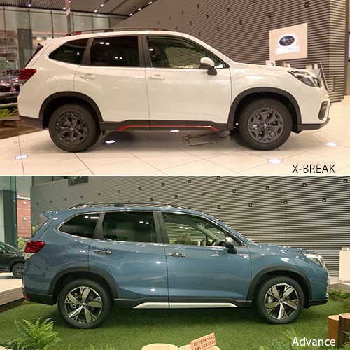 それでは新型フォレスターの各部を写真で見る事にするが、エクステリアは X-BRAKE を主として、参考にハイブリッドの Advance も並べておく。