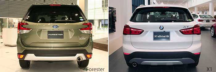 そこで先ずは例によって斜め前後からの比較を行ってみる。BMW X1 は SUV としては比較的全高が低く、言ってみればステーションワゴン的な要素の強いクルマだが、こうして見るとフォレスターも似たようなフォルムに見える。そこでスペックを見ると全高はフォレスターが 1,715㎜ で X1 は1,610㎜ で、何とフォレスターの方が 100㎜ も高かった。X1 見た目以上に全高が低いクルマだった。