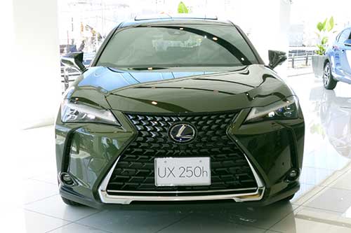 それでは UX の各部を見る事にする。なお写真のクルマは UX250h AWD version L で価格は 535万円となり、何と500万円の大台を超えている。そしてボディーカラーはテレーンカーキマイカメタリック<6X4>という黒に近いが良く見るとグリーンが入っているというものだ。
