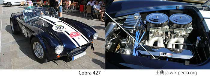 英国の小規模メーカーである AC カーズがフォード製 V8 エンジンを搭載したロードスタータイプの2シータ-スポーツカーがコブラで、年代やグレードにより各種排気量のエンジンを搭載していた。その中でもコブラ 427 と呼ばれるモデルはフォード製7.0L 425ps エンジンを搭載していて、軽量 (975㎏) なボディとの組み合わせは強烈で、その P/W レシオは何と 2.3kg/ps という値だ。