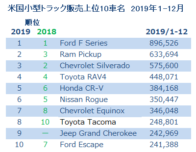 前回の続きとして2019年米国小型自動車販売結果から乗用車および小型トラックのトップ10 を纏めてみる。