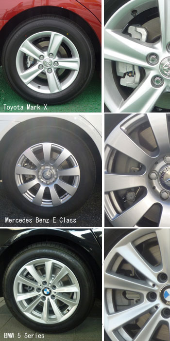 マークXはホイールが小さいのに、内部のローターは更に小さい。これはブレーキキャリパーの形状にも問題がありそうで、ホイールいっぱいのローターが使えないことになる。そのキャリパーは3車とも片押しのシングルピストンのようだが、欧州の2車はアルミのボディー