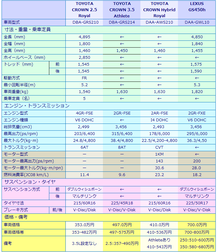 という訳で、今回のクラウンはフルチェンジというよりもビッグマイナーと言いたいくらいに、主要のコンポーネントは使い回しだし、今までは兄弟車だったレクサスGSが大幅に改良されたのでクラウンはどうなるのかと思っていたのだが、これで完全に兄弟の縁は切れて、GSはワンランク上の世界戦略車(今のところは米国主体だが)となり、クラウンは国内(と中国)向けにターゲットを絞ったオヤジセダンに逆戻りとなってしまった。10年前のゼロ・クラウンへの変身で、クラウンもやっとマトモな道を目指し始めたのかと喜んだのも束の間で、結局モデルチェンジ毎に昔に戻ってしまった。まあ、ユーザーが求めるのだから仕方がないが、結局優秀な政府を持つには国民が優秀であることが必要なのと同じで、優秀なクルマが主流になるには優秀なユーザーが必要ということだ。 となると、走りの方もあまり期待できないが、ハテ? |