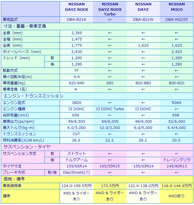 ここで現在販売されているニッサンの軽乗用車の諸元を一覧にしておく。軽乗用車とワザワザ表現したのは、前述のようにd商用バンのクリッパーがあるかあるからだ。