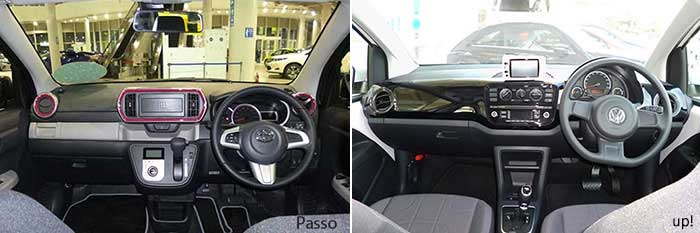 一番の違いはパッソの AT セレクターがセンタークラスターというかインパネに付いていて、その隣にはエアコン操作パネルがある。要するに’インパネシフトであり、この構成は言ってみれば軽自動車によるある方法だ。 対する up! はダッシュボード上部にはエアコンとオーディオの操作パネルがあり、他車では当然この付近に配置されるエアアウトレットが存在しない。