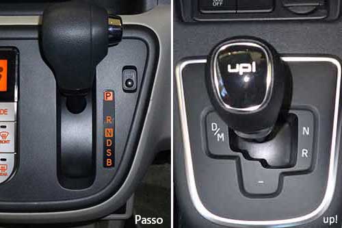 パッソのATセレクターはインパネシフトでそのパターンは直線式で、P→R→N →Dまではティプトロタイプと同じだが、その手前にS(スポーツ?) およびB(エンジンブレーキ、降坂用) が付いていて、マニュアルモードは無い。まあ CVT だから本来マニュアルモードなんていうのは無意味だし、この手のクルマをマニュアル操作したいユーザーもいないだろう。 パッソとは対照的にup! の場合はオートマモードもあるが実際には2ペダルのシングルクラッチ方式セミオートであり、セレクターも独特のパターンを持っている。これは上手く使えばメリットは多いが、普通のATの積りで使うと性能の悪さに唖然とするだろう。実際、up! を日本で販売する場合の最大の欠点はこのミッションであり、これがトルコン AT や DCT だったら大ベストセラーになっても良さそうだが、これではマニアしか買わないクルマとなってしまう。