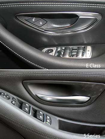 E クラスと5シリーズのセンタークラスターに装着されたエアコンとオーディオパネルは当然それぞれのメーカーなりのデザインであり、お互い個性豊かな形状をしている。E クラスは伝統的にアナログ時計を装着しているが、その場所は以前は何とメータークラスター上に回転計並の大きさでドッカと居座っていた。 5シリーズは既に末期モデルだが、新型のセンタークラスターはどこまで近代化されるかは楽しみだ。ただし先にFMC により G11となった7シリーズのオーディオ&エアコンユニットは高さが低く (薄く) なっているから、恐らく5シリーズもこれに準じるのだろう。