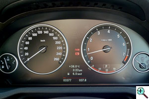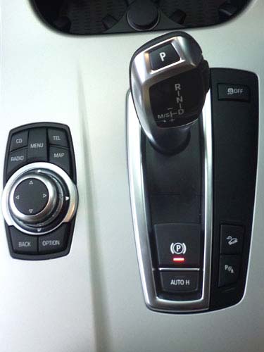 エンジンが掛かって、回転計が800rpm程度を指しているメーターを見て気が付くのは、メータークラスターに並ぶ4つのメーターも5シリーズと同じだということだ(写真24)。そして、5シリーズと同じ電子式のセレクター(写真22)をDに入れて、これまた5シリーズと同じパーキングブレーキスイッチを押して解除して、駐車場内をユックリと移動するときの第一印象は、チョッとステアリングが軽めだが、基本的にはBMWそのものという感じだ。公道の前で一時停止して、クルマの流れ
