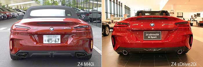 フロントを比較した時、ルーフは殆ど見えないので違いは判らないのは当然だが、それ以外で両車を比較すると M40i のキドニーグリルはブラックアウトされていて、それだけの事でも随分と雰囲気が異なり精悍さが増している (写真6) 。というか 20i クロームのボチボチはどうも好きになれない。 リアについての最大の違いはその排気管で、M40i は左右其々に横長で一見ダブルに見えるマフラーカッタ―を左右から出ていて高性能車の雰囲気が出ている。対する 20i では左右から太めの丸い排気管であり、一応差別化されている (写真7) 。最近はこの横長のマフラーカッタ―が流行っているようだが、やはりこれはオーソドックスに丸の2本の方が自然だと思うのだが、まあ好みの問題だろうか。 そのリアでグレードを確認するもう一つの方法はエンブレムであり、M40i は "Mロゴ"+ "M40i" で、 20i は " s Drive" と "20i" で Mロゴは無い (写真8) 。これは以前から BMW に共通していた方式で、通常モデルの M Sport では室内やフェンダーサイドにはMロゴを平気でサービスするが、リアのエンブレムにMロゴが付くのはMパフォーマンス以上のモデルのみだ。まあ、補修部品でエンブレムを買って貼れば良いだけの話だが‥‥。 と思って写真8 を再度見たらば 20i のエンブレムは小さい為に、この隣に" s Drive" を剥がして "Mロゴ"を貼ってもバランスが取れないですぐバレるのだった。あっそうか、20i も剥がしてMのみにすれば良いのだった。そう言えばMのみを貼った BMW って結構見かけるよね。 |