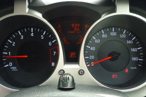 赤信号で停止して、ATセレクターをDからMの位置にして、メーター内の表示も”1”になっていることを確認して青信号によりフルスロットルを踏むと、クルマはモアーっと加速をしていくが、回転計の指針