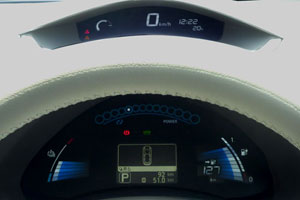 今回は何の予備知識も無くキーを持ってクルマに乗り込んだので、シートに座ってさてどうするかと周りを見回すとステアリングコラムの左側のダッシュボード上にそれらしき丸いスイッチを見つけた(写真左下)。EVといっても、HVなどと同じだろうということで、ブレーキペダルに足を載せてスタートボタンを押してみると、正面のメータークラスター内が点灯してチョッとしたイベントというか、各種表示部が順番に点灯してから、定常の表示となった。勿論、エンジンは無いからアイドリングは無いし、スタートボタンを押しても無音だから違和感があるといえばあるが、最近はHVでも同様な場合が