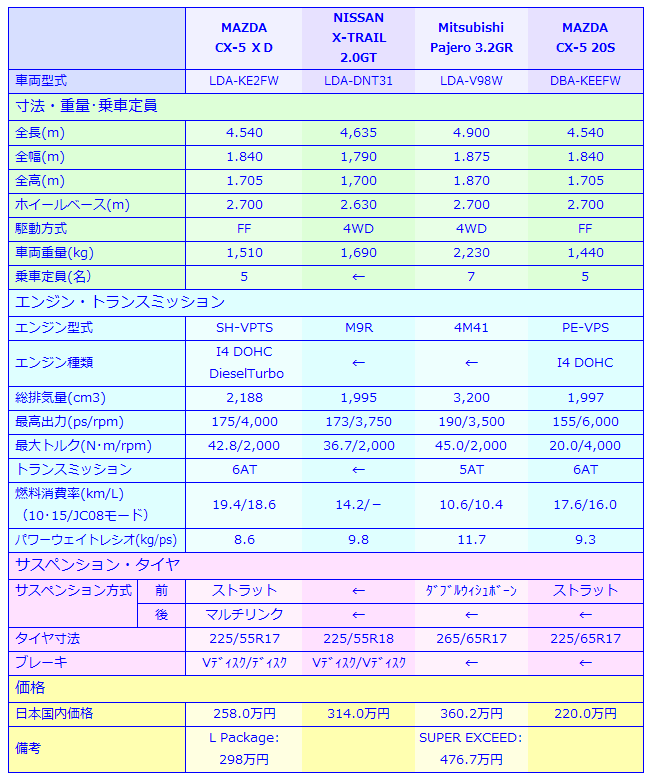 ここで、これら国産ディーゼルエンジン搭載車の緒元を比較してみる。これに加えてCX-5のガソリン車も追加してある。