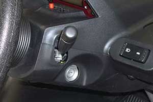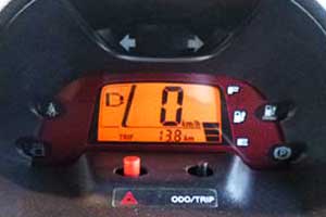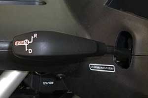 試乗車に近付いてみるとオプションのキャンバスドアが付いているようで乗り込むのに、さて、どうや システムの電源をオンにするにはステアリングコラム右側面のキーホールに金属キーを差し込んで右に撚るという、今時は軽自動車でも殆ど見かけない方法だが、考えてみたらコムスは軽自動車以下のミニカーというか法律上は原付だから、まあコンナモノでしょう。電源を入れると正面のメータークラスターの液晶パネルのバックライトが点灯すして数字が現れ、大きめの数字で速度のデジタル表示と次に述べるセレクターのポジション表示、そして小さい文字で走行距離が表示される。更に右下には電池の残量計らしきものがある。