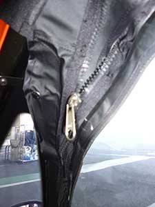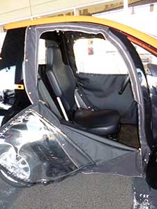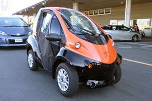 その後はまた狭いコーナーを抜けて波状路に進むと、大した凸凹では無いにも関わらずクルマは盛大に揺すられて、勿論直進性なんて言うものはどこかへ忘れてしまったかのようだ。その後は出発点を通過してもう1周するのだが、ハッキリ言って気が重い。まあそれでも2周目は少し慣れたこともあり1周目程の恐怖感はなかったが、それにしても酷いクルマ、もとい原付だ。最後に停止位置に近付いて20km/hくらいからブレーキペダルに足を載せるとクーっという回生ブレーキの音と共に結構な減速度を感じたので油断したのがいけなかった。そこからフートブレーキを踏んでも殆ど減速度は増えずスーっと滑っていく感じで、慌ててフルに踏んで何とか止まることが出来た。回生ブレーキについては40km/hでは感じなかったのは、このくらいの高速!では上手く回生が効かないのかとも思うが、さてどんなものだろうか? 停止後パーキングブレーキレバーを引いてセレクトレバーを上に持ち上げて N に戻してベルトを外し、ドアを開けるためのノブを探そうとして思い出した。そう、このドアにはノブもヒンジも無く、ジッパーをジーっとやってキャンバスを下に垂れ下げて、そこを跨いで降りたのだった。 それにしても走る (動力性能) はまあまあとしても、曲がるは問題外の低レベルであり、止まるに関しては危険レベル、いや曲がるも危険レベルだが、いくら原付登録とはいえ今時この性能はあんまりだ。それで価格は80万円となれば、一体誰が買うのだろうか?? 注記:この試乗記は2014年12月現在の内容です。