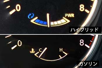 ここで正面のメータークラスターに視線を移すと、何を隠そうガソリンのモデルとほぼ同じ (写真34) だが、違いを探すと2つの大径メーターのうち左側の回転計の中に組み込まれた小径メーターがガソリン車の水温計に対して HV ではパワーメーターとなる (写真35) 。加えて中央の液晶ディスプレイが HV ではエネルギーモニターという電力の情況を表示するお馴染のモノとなる (写真36、表示の変更も可) が、ガソリン車と共用している関係もあり少し表示が小さいようにも感じる。 実はこのメーターの違いはソフト的にどうにでも変更できる液晶の表示を変えているだけだから、ハードウェアとしては共通となる訳で、このクルマに限らないがメーターの液晶化のコストメリットは大きいだろうし、近い将来はメカ式のアナログメーターが絶滅しているに違いない。 |