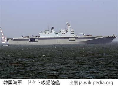 韓国軍の強襲揚陸艦はドクト級(14,300t)で、日本のおおすみ級(8,900t)よりは大きいがいずも(19,500t)より小さい。そしてドクト級は例によってお笑い韓国兵器まる出しで、その辺の詳細は1月10日ブログ「【自衛隊 vs 韓国軍】 強襲揚陸艦」にて。