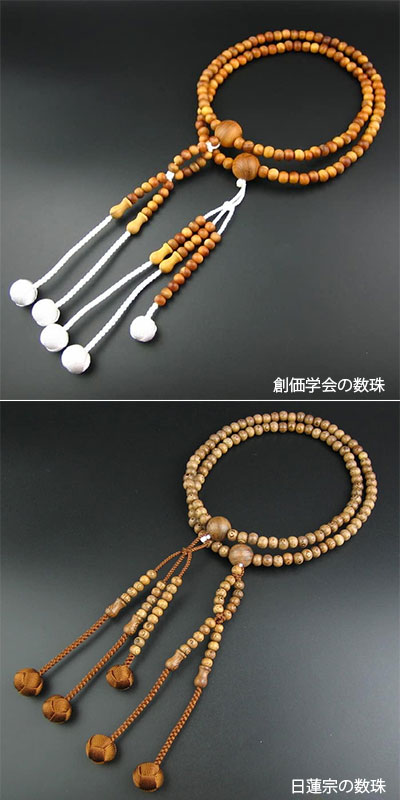 それでは、創価学会の数珠はというと、形状としては日蓮宗の本式数珠と同じだが、多くの場合は房が白となっている。