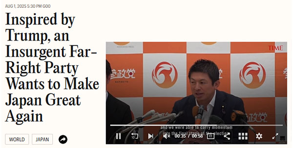 タイム:トランプ大統領に刺激を受けた極右政党が日本を再び偉大な国にしたいと躍起になっている