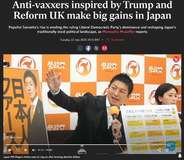 参議院選挙での参政党の躍進について、各国の主要メディアが日本でも反グローバリズム政党が躍進したと報じている。