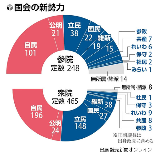 連立相手として最も有力なのは国民民主であるが、両党を合わせても両院とも過半数には足りない。そこで維新を加えるという案が出てくるが、国民民主と維新が上手く調整できるか。