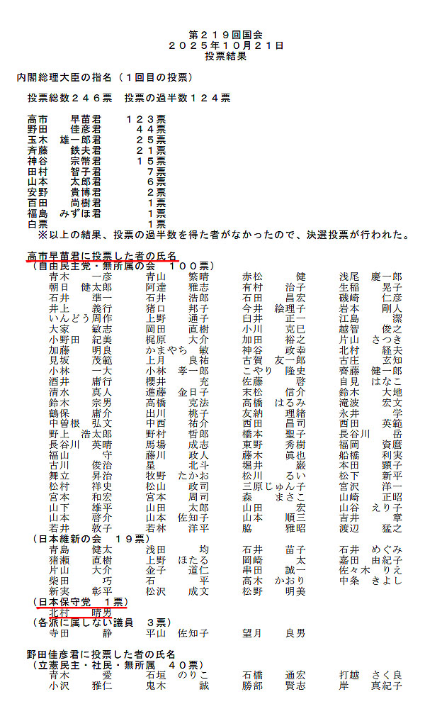 あれっ、日本保守党(日保)の北村晴男君も高市君に投票しているぞ。