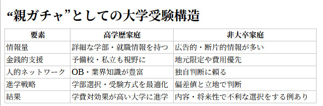 要するに、大学受験は確かに「親の学歴ガチャ」でもあり、家庭の教育リテラシー差が進路の質を左右する事実が、研究・体験の両方で裏付けられています。