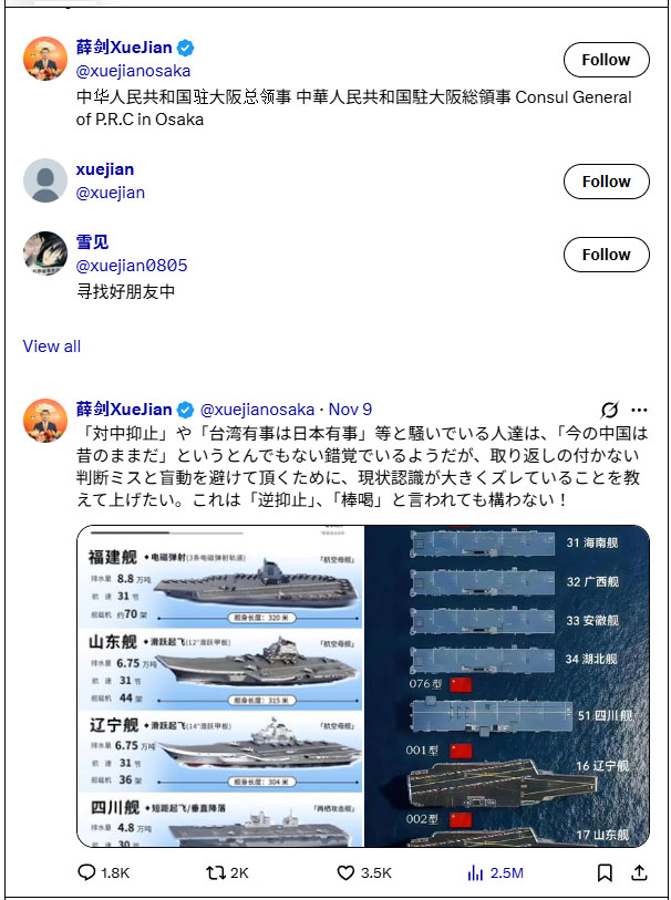 中国の大阪総領事が高市首相の「殺害」を予告して恫喝した問題で、日本中が大騒ぎになっているが、問題のXの投稿(薛剑XueJian)は知らん顔して削除したようだ。