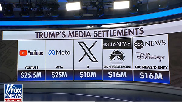 Trump has already gained $25M from YouTube, Meta, $10M from X, and $16M from CBS and ABC