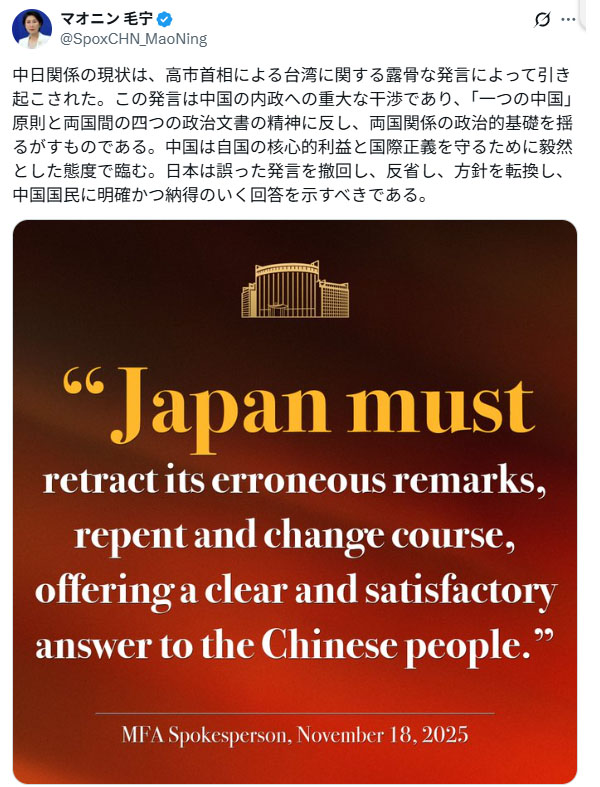 #中国 #台湾 #大喜利 pic.twitter.com/xEVCZw8KoY— あきら (@whiskeyathome) November 17, 2025