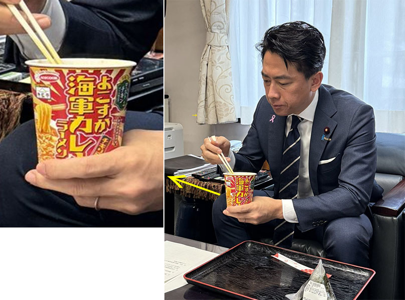 小泉防衛相が自身のXに投稿したランチ風景は、『地元・神奈川県横須賀市の名物『魚藍亭監修』のよこすか海軍カレーラーメン・チキン味』で、しかも、商品名が見やすいように手の位置を考えているという気の配りようだ。