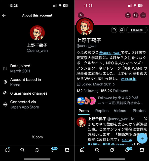 X(旧Twitter)の仕様が変更され、そのアカウントが「どの国にいるか」が見える機能が追加された。確認したいユーザーのプロフィール欄から「YYYY年M月からXを利用しています」という部分を開くと、「アカウントの所在地が表示されるようになった。