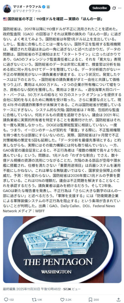 米国防省が不正流用を認めたという内容のXへの投稿があったのだが‥‥。