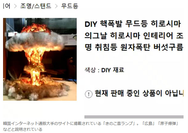 ところで、この問題のメンバーは中国人の「ミンミン」というらしいが、投稿していた原爆のきのこ雲をイメージしたランプの写真は、韓国インターネット通販大手のサイトに、同一とみられる商品が「核爆発」「広島」「原子爆弾」などと明記されていることが分かった。