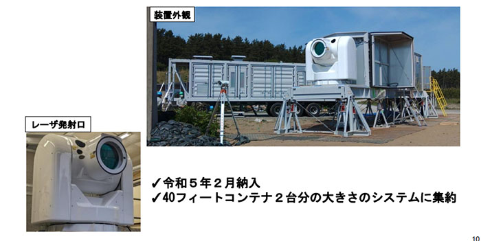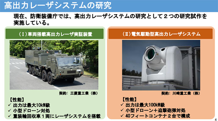 この資料によれば、車両搭載高出力レーザーシステムとして、三菱重工と契約した重装輪車両に搭載した10Kw級と、40フィートコンテナ2台で構成される川崎重工と契約した100KW級の2種類がある。