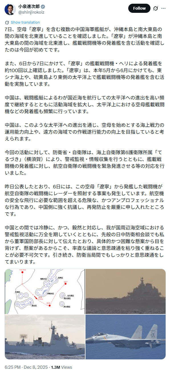 高市政権で防衛相となった小泉進次郎議員は、まさに水を得た魚状態で以前とは別人のような行動力を見せている。その小泉氏が自身のⅩで空母遼寧を含む艦艇が沖縄本島と南大東島間の海域を北上する状況を詳細に公開した。