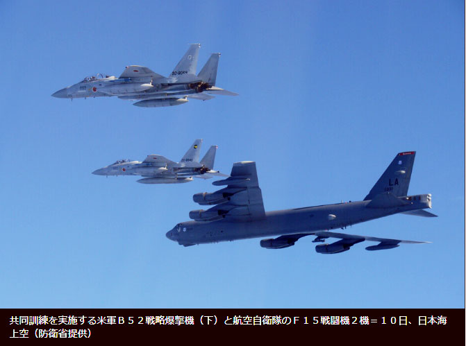 これに対して、航空自衛隊の戦闘機6機と米軍B52戦略爆撃機2機が10日に日本海上空で共同訓練を行ったと発表された。