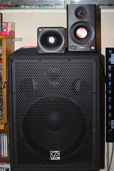 次に、主力として使用している30㎝ウーハーとホーンツイータの2ウェイスピーカーに換えてみる。このスピーカーはPA用の低価格品で、その道ではコスパ抜群で有名なもので、これに同メーカーの上位製品用のホーンツイータをつけたものだ。そしてアンプは、これまたPA用のコスパ抜群製品で、この組み合わせは知る人ぞ知る、価格からはあり得ない高音質のものだ。