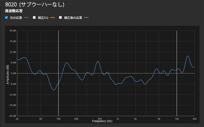 周波数特性だけ比べればそれほど大きな違いは無い。ただし、8020の重低音はサブウーハーが無くてもデーター上はかなり低い方まで出ている。