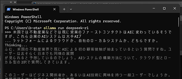 そこで、1週間ほど前に早速試して見たのだが、とにかく動きが遅くて使い物にならなかった。ところが今回、再度チャレンジしてみたら何と十分な速さ、まるでクラウドであるChatGPT並みの速度で回答が来た。