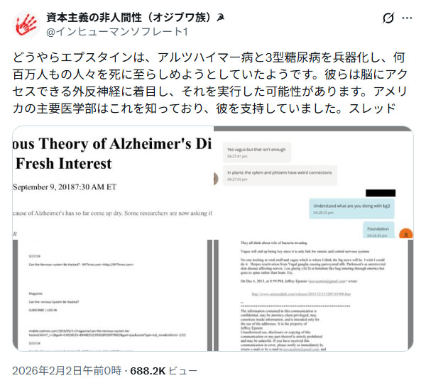 小児性愛で世界中のセレブが関わったという「乱交島」の所有者エプスタイン が、何とアルツハイマー病と3型糖尿病を発症する細菌兵器を開発しようとしていた、という説が出てきた。