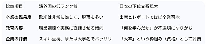 存在意義: 実務教育に特化している大学も多く、学力が低くても「特定のスキル」を身につける場として機能している点は、日本の文系私大とは少し毛色が異なる。