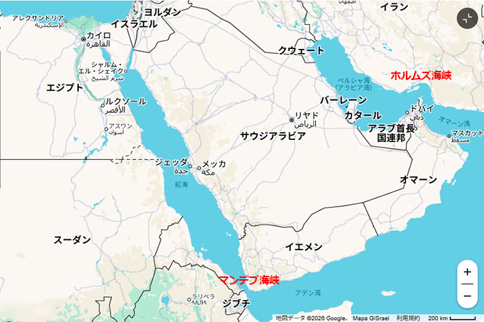 すでにイランがホルムズ海峡の封鎖を宣言しているが、フーシ派*の参戦により、紅海の入り口であるバブ・エル・マンデブ海峡(マンデブ海峡)も事実上の戦域となる。