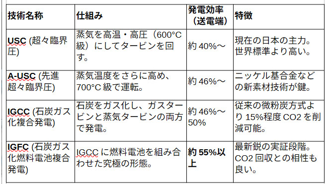 石炭火力は、蒸気の温度と圧力を上げるほど効率が高まり、CO2排出量を抑制できる。日本は以下の段階的な技術を有している。