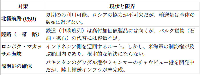 ◦ ミャンマー・パキスタン経由:建設や稼働が進んでいるが、合計しても日量100万バレルに満たず、海上ルートの穴を埋めるには程遠い状態だ。