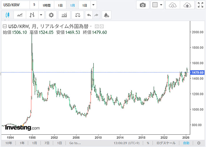 • 通貨安(ウォン安):ウォン相場が約17年ぶりの安値を更新。
