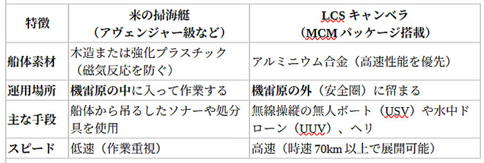 最大の差は、「船自体が機雷原に入るか、外から遠隔で処理するか」という思想の違いだ。