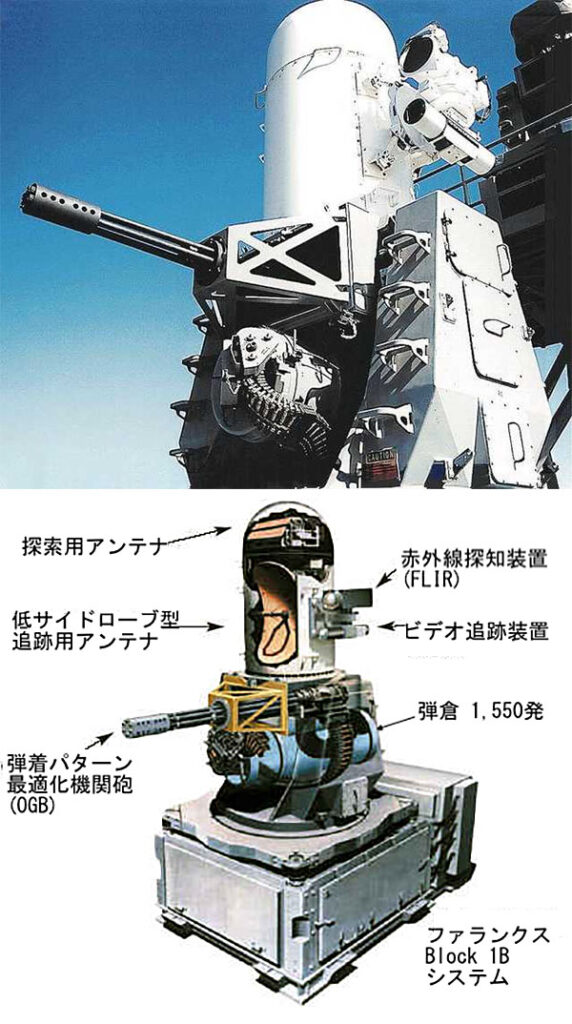 • FLIR(赤外線前方監視装置)の追加:従来のファランクスはレーダーのみで目標を追尾していたが、Block 1Bからは赤外線カメラ(FLIR)が搭載された。これにより、レーダーに映りにくい小型の木製・プラスチック製ボートも視覚的に捉え、正確に照準を合わせることが可能となる。