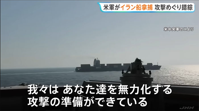 • 経緯:米軍が実施している海上封鎖の突破を試みたとして、数時間にわたり警告を実施。しかし、当該船が停止命令を無視して航行を続けたため、米軍は機関室付近へ発砲して船を不能にし、強制的に停止させた。その後、米海兵隊が船に乗り込み、制圧・拿捕した。